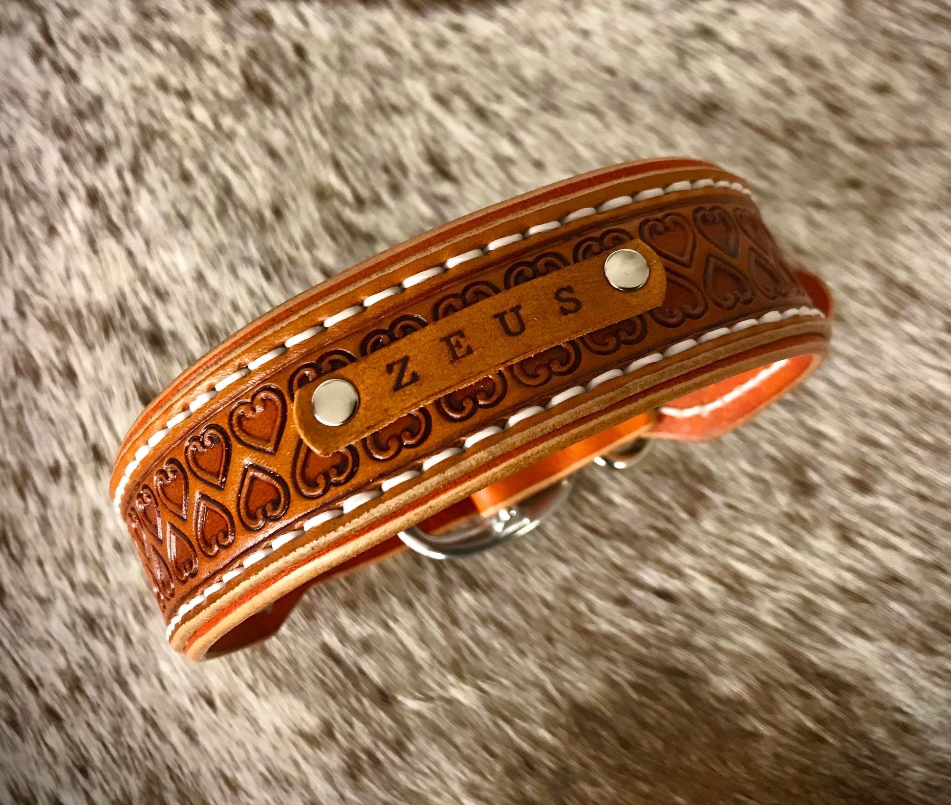 -----ITEM DESCRIPTION----- This durable, personalized and measured to order leather collar is made of genuine leather and I hand tool and dye to make it extra special for you and your pets! Different colours and design can be requested and I will be happy to make it for you. If you would like name, initials, please let me know!!